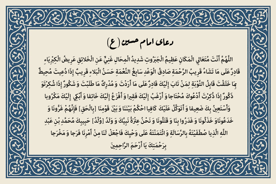 اللَّهُمَّ وَ هَبْ لَنَا فِي هَذَا الْيَوْمِ خَيْرَ مَوْهِبَةٍ وَ أَنْجِحْ لَنَا فِيهِ كُلَّ طَلِبَةٍ كَمَا وَهَبْتَ الْحُسَيْنَ لِمُحَمَّدٍ جَدِّهِ وَ عَاذَ فُطْرُسُ بِمَهْدِهِ فَنَحْنُ عَائِذُونَ بِقَبْرِهِ مِنْ بَعْدِهِ نَشْهَدُ تُرْبَتَهُ وَ نَنْتَظِرُ أَوْبَتَهُ آمِينَ رَبَّ الْعَالَمِينَ.