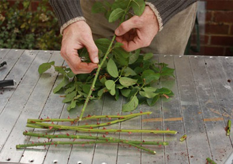 ۲. طول قلمه گل محمدی باید بین ۷ الی ۱۰ سانتیمتر باشد. برای آماده سازی قلمه، می توانید تنها دو برگ در نوک آن گذاشته و باقی برگها را بچینید. زیرا زمانی که بخواهید آن را در خاک قرار دهید، برگهای پایین ساقه در خاک رفته و خراب می شوند.