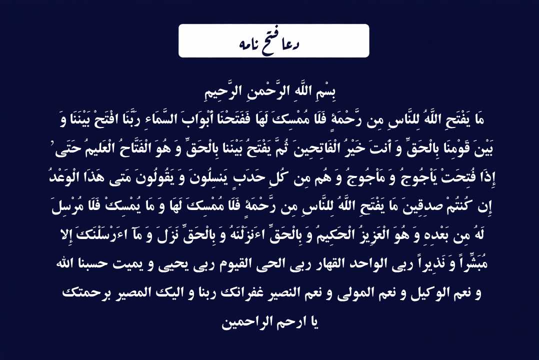 - خواندن دعای فتحنامه به عنوان بهترین دعای شفای مریض حتی میتواند بیماری را هم شفا بدهد.