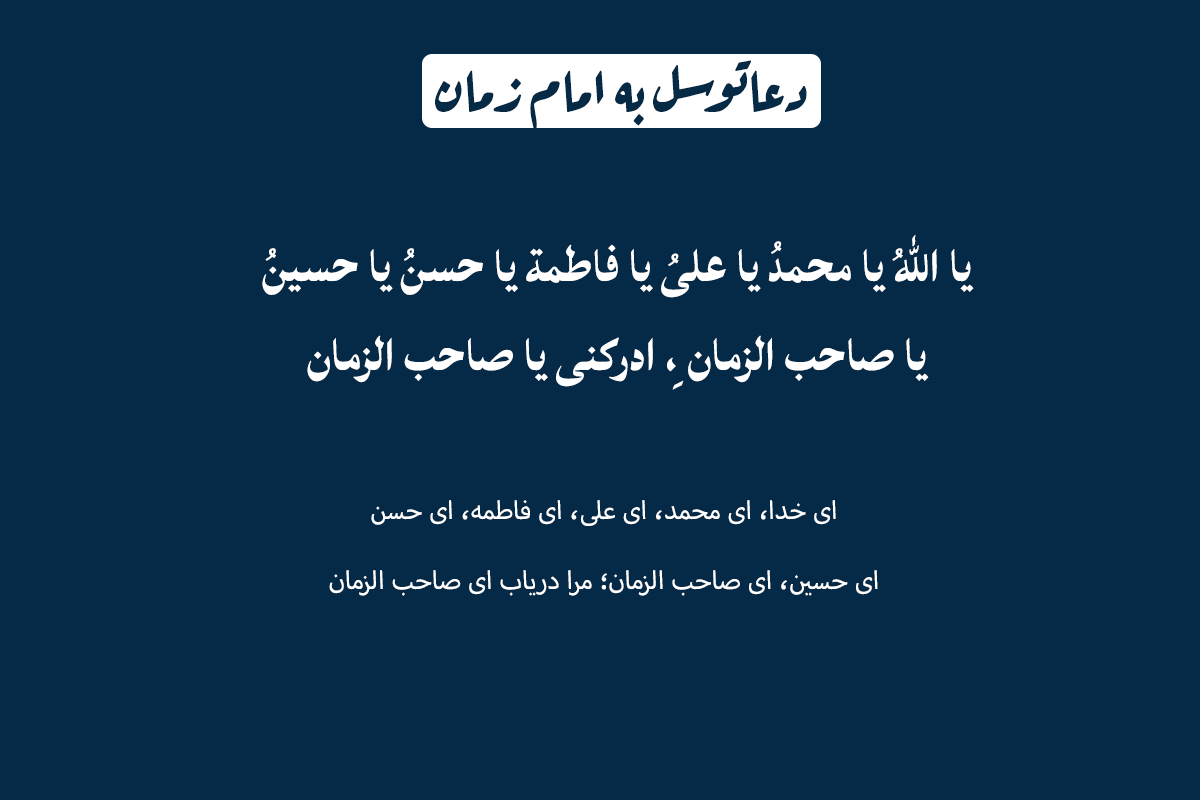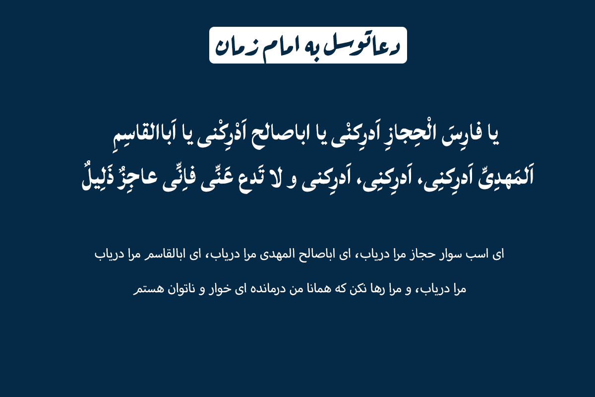 ای خدا، ای محمد، ای علی، ای فاطمه، ای صاحب الزمان، مرا دریاب و هلاکم نکن. منبع: (صحیفهٔ مهدیه: ۶۳۵)