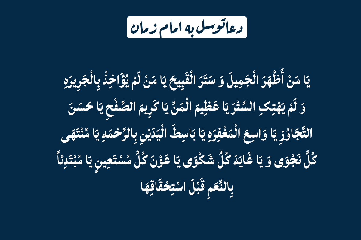 ای سرورم ای صاحب الزمان، ای فرزند رسول خدا، حاجت من این و آن است؛ در برآورده شدن حاجاتم نزد خدا واسطه شو، من با حاجاتم بهسوی تو رو کردم، چون میدانم شفاعت تو نزد خدا پذیرفته میشود و مقام تو در بارگاهش بس ستوده است، پس به حق آن که شما را به امر خویش خاص گرداند و برای بیان اسرارش برگزید و به حق جایگاهی که شما در پیشگاه خدا دارید که تنها بین شما و اوست، برآوردن خواهشم، اجابت دعایم و برطرف شدن اندوهم را از خدا بخواه.