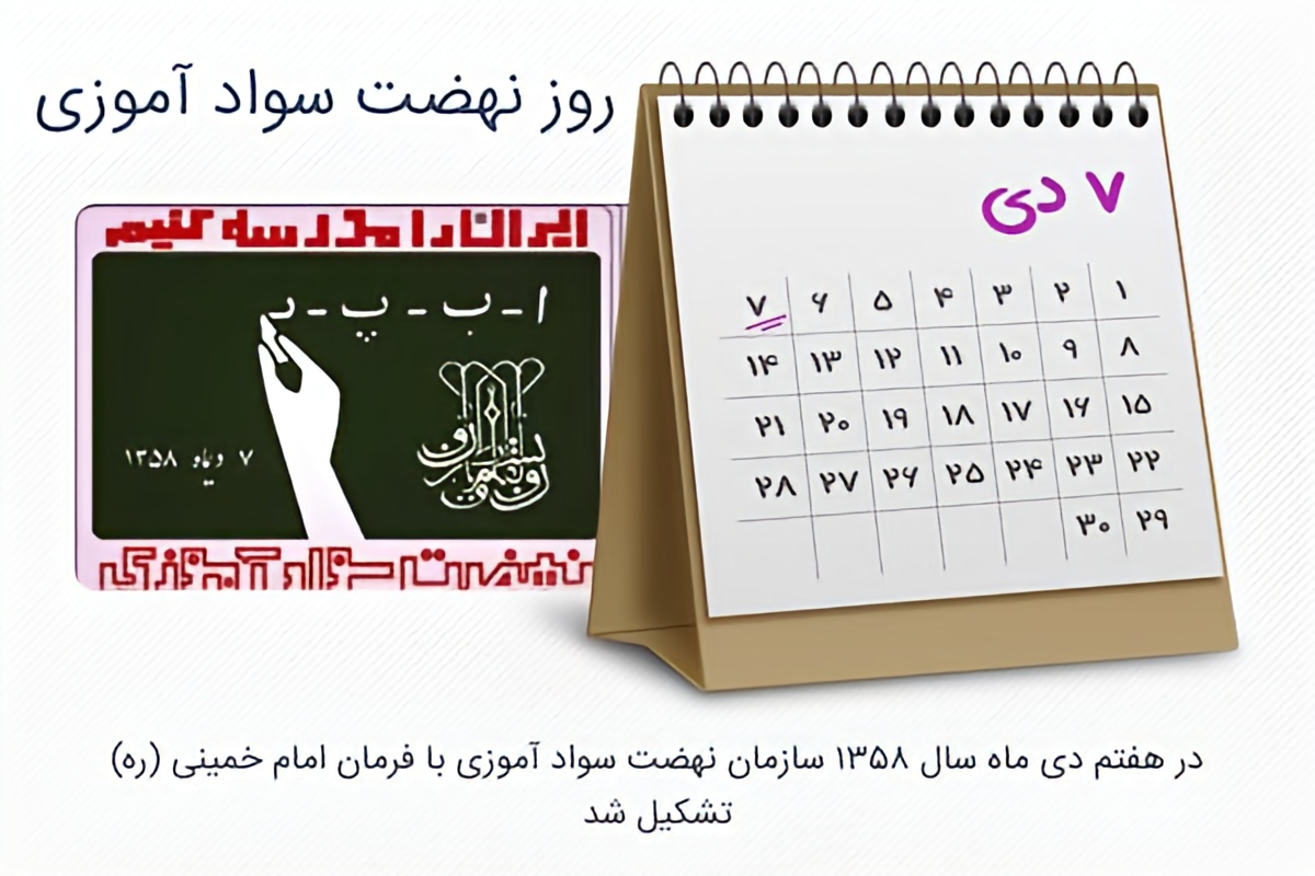 در تاریخ ۷ دی ماه ۱۳۵۸ امام خمینی رحمه الله فرمانی مبنی بر تشکیل نهضت سواد آموزی صادر کردند. این فرمان که با تدبیر و حکمت امام به انجام رسید آثار و نتایج فراوانی به همراه داشت. شکل گیری و فعالیت «نهضت سواد آموزی» نیز مانند خیلی از نهادها و ارگانهای کشور از ثمرات انقلاب اسلامی است که تحولی بزرگ در کشور ما پدید آورد. سالروز صدور این فرمان و تشکیل نهضت سواد آموزی، «روز ملی سواد آموزی» و یا «روز نهضت سوادآموزی» نامگذاری شده است. گفتنی است «روز جهانی و بینالمللی سوادآموزی» نیز در روز ۸ سپتامبر است.