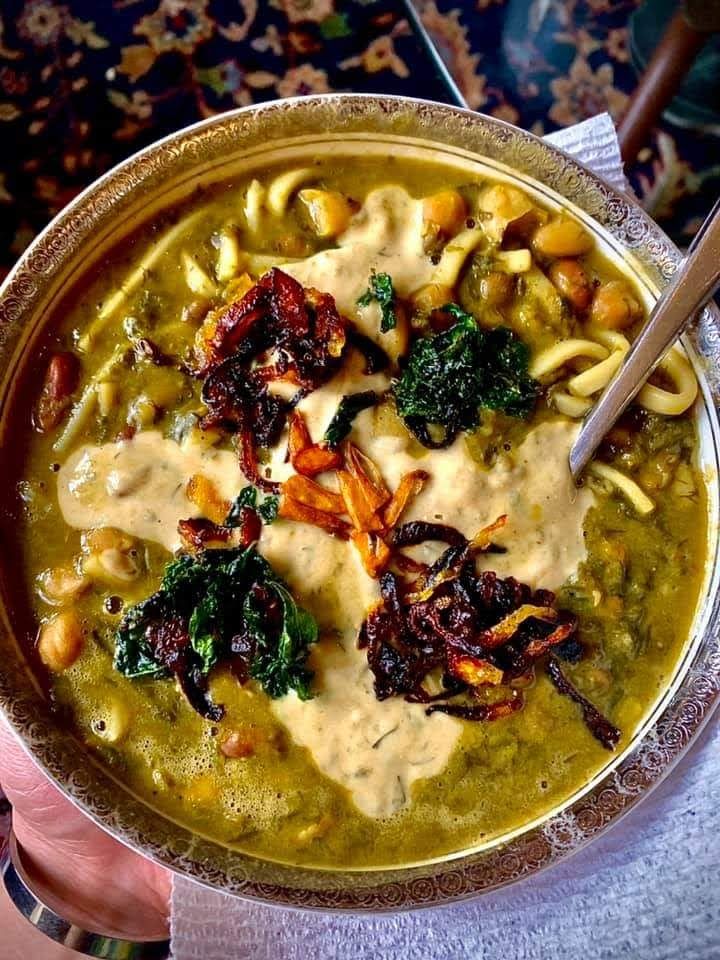 آموزش طرز پخت آش رشته نذری برای ۱۵ نفر با مقدار رشته آش، سبزی تازه و حبوبات؛ دستور آش رشته خانگی پرملات و لعابدار.
