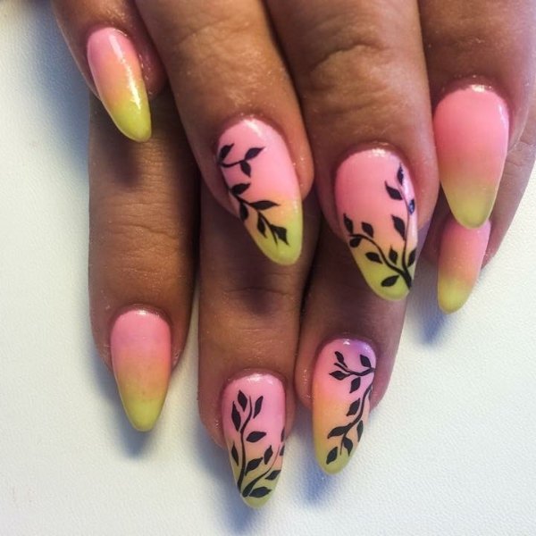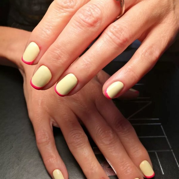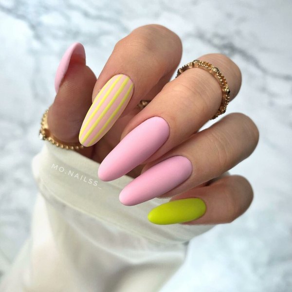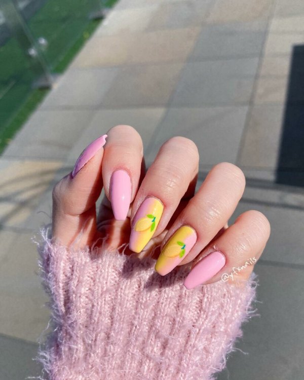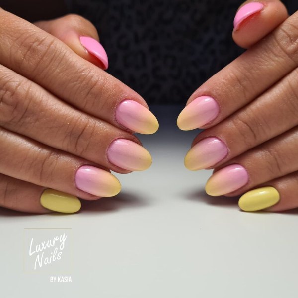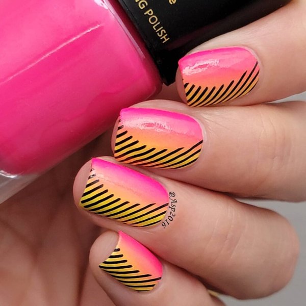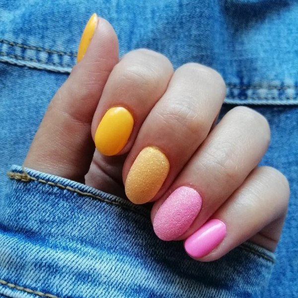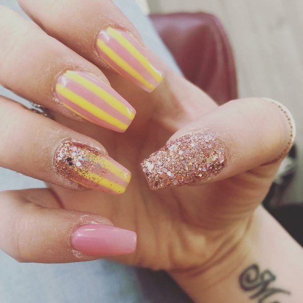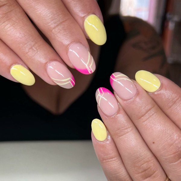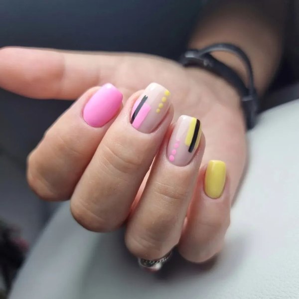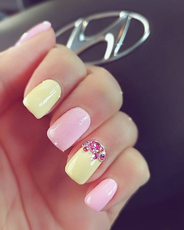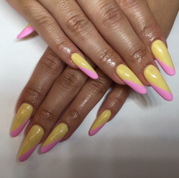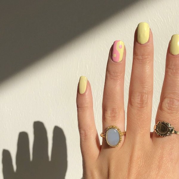 طرح لاک ناخن ترکیبی صورتی و زرد رنگ