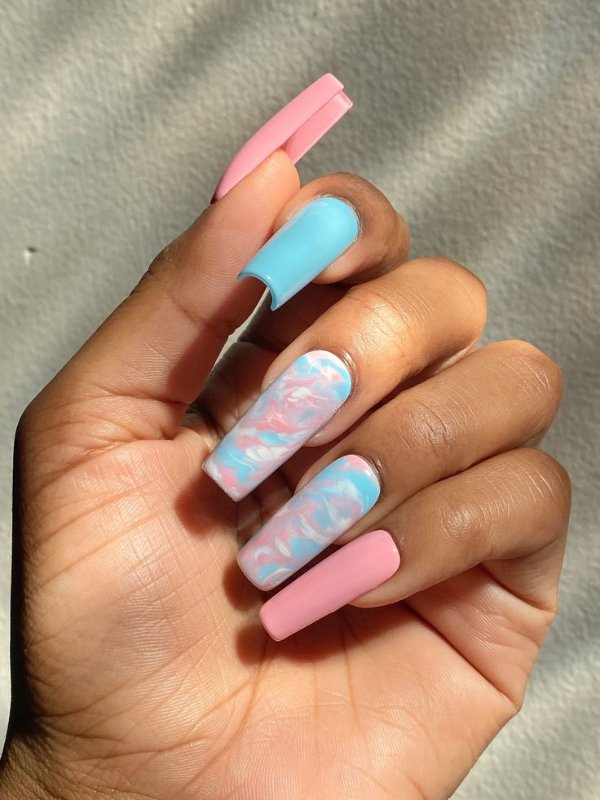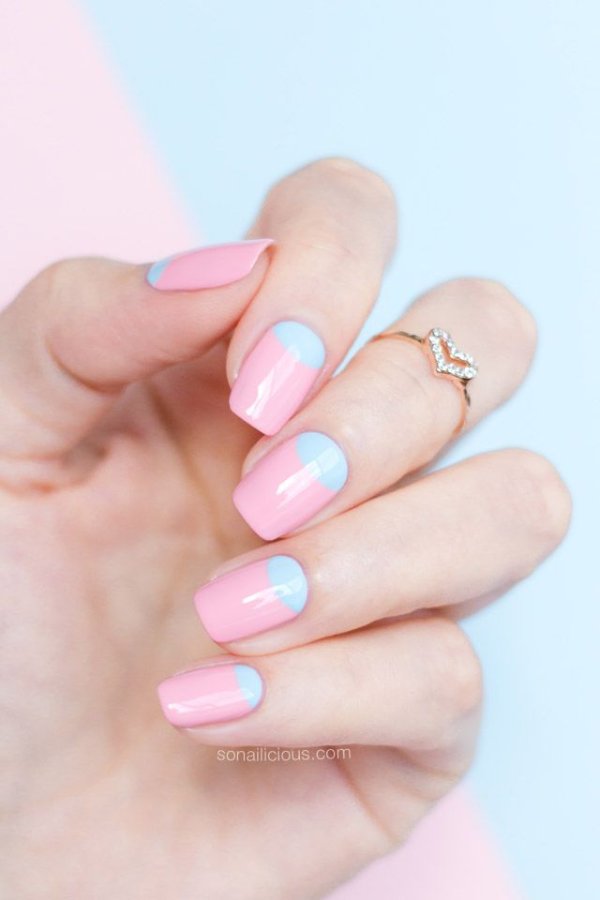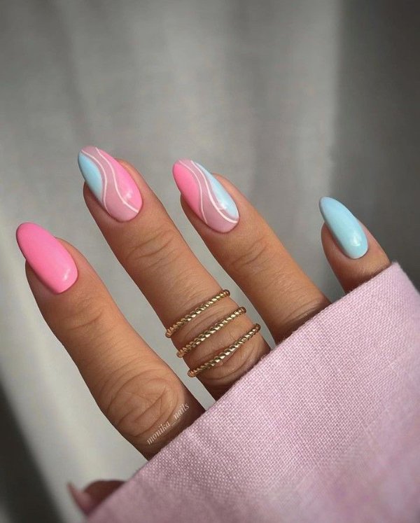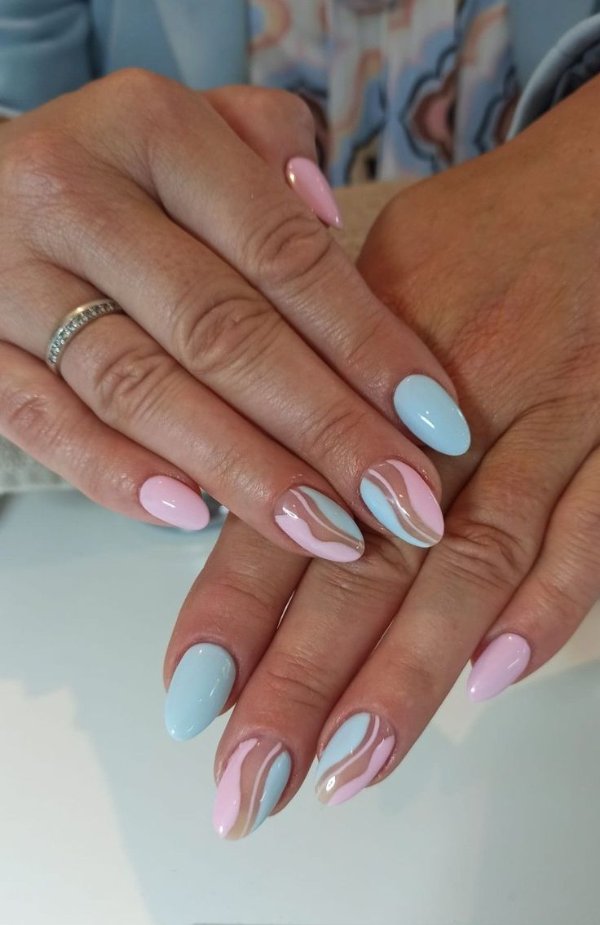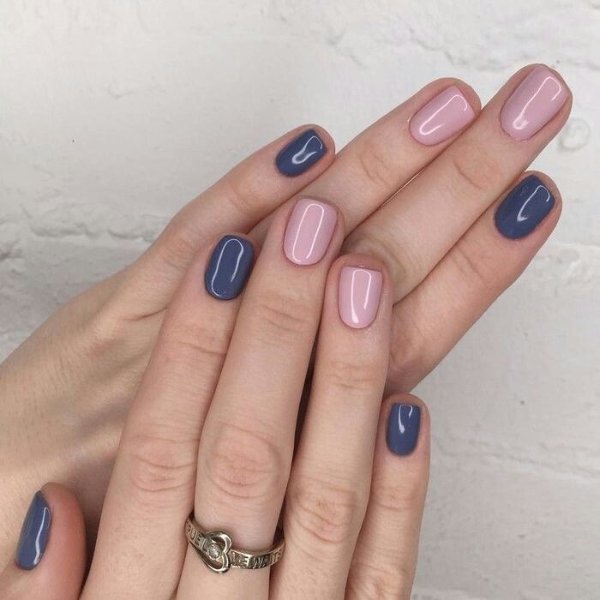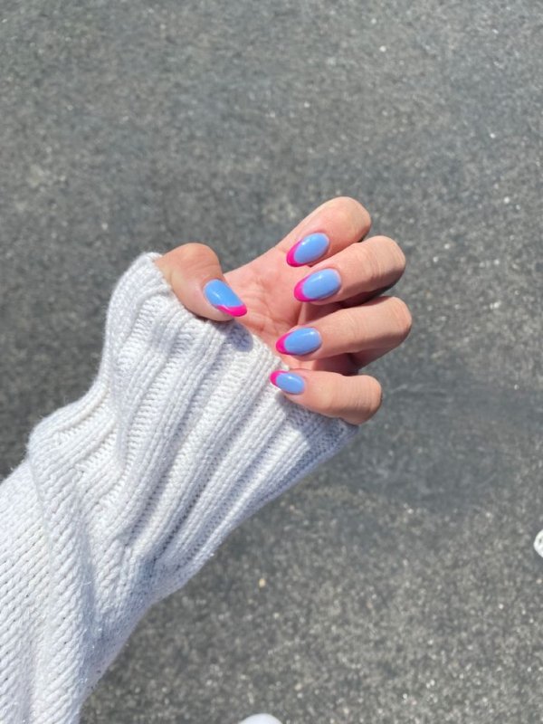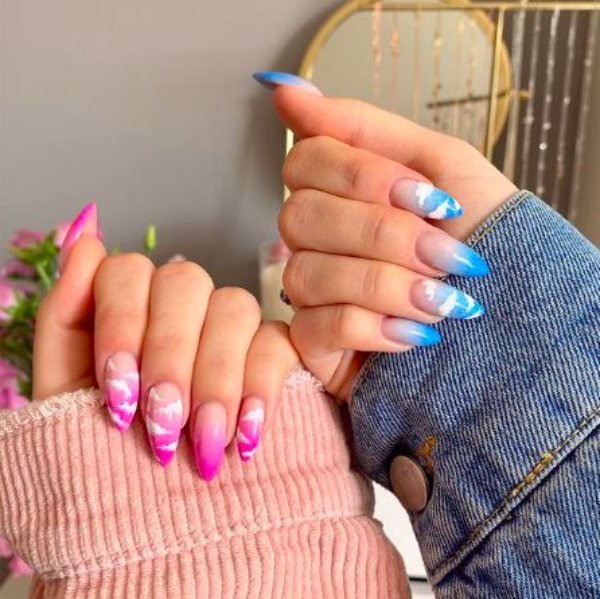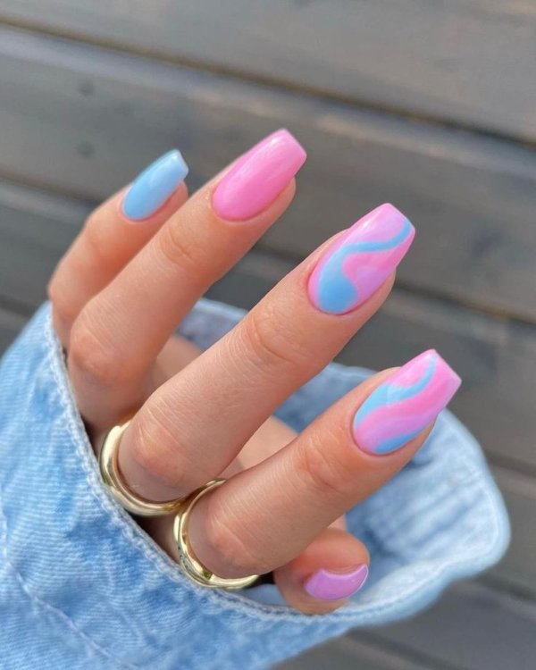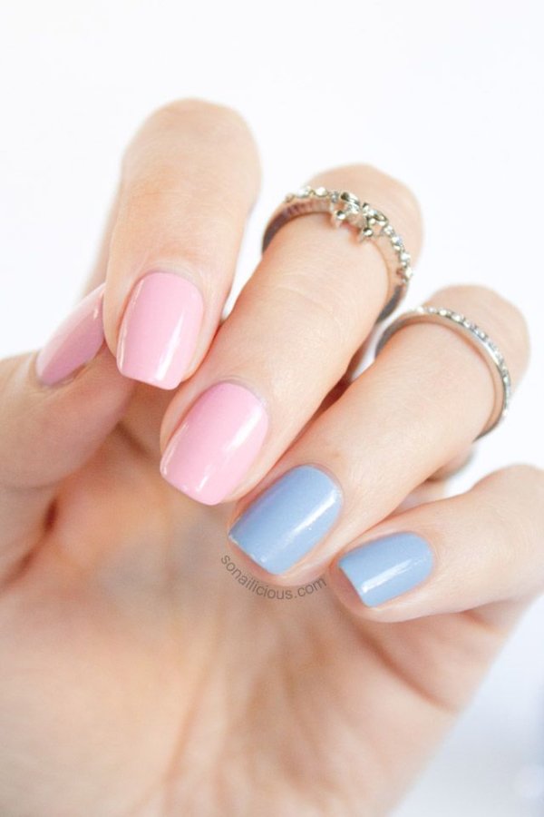 دو رنگ آبی و صورتی در ترکیب با هم حسی تمیزی، رویا، لطافت و معصومیت القا میکنند و به خصوص برای دختران نوجوان انتخابی عالی برای طرح روی ناخن هستند.