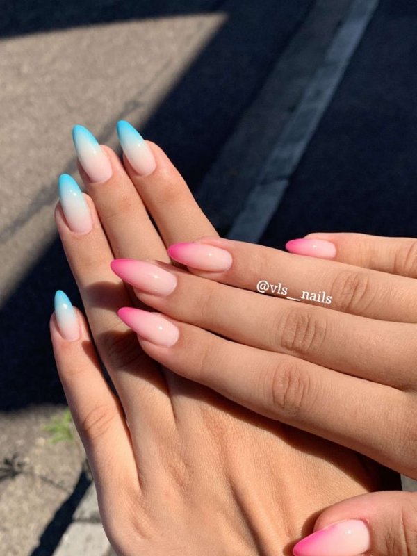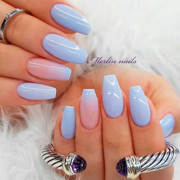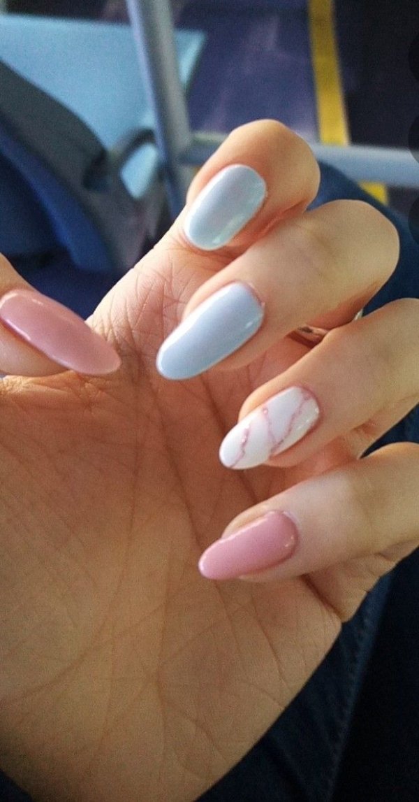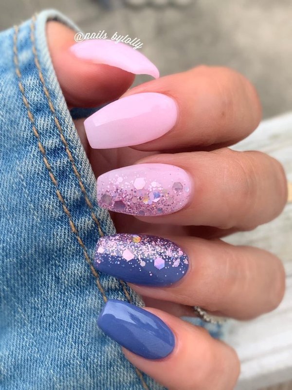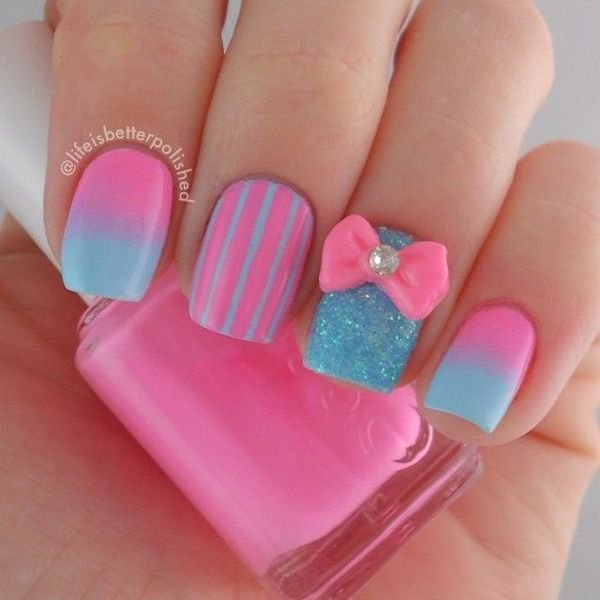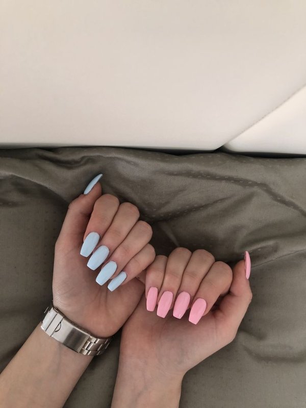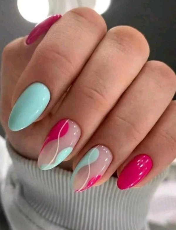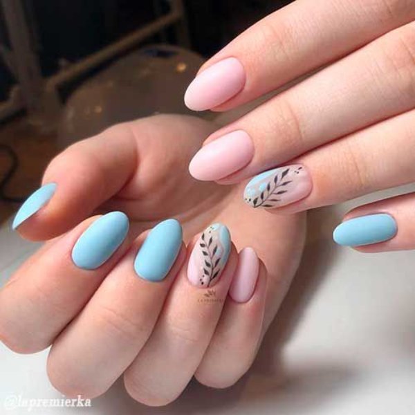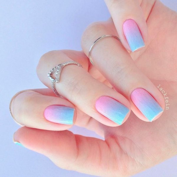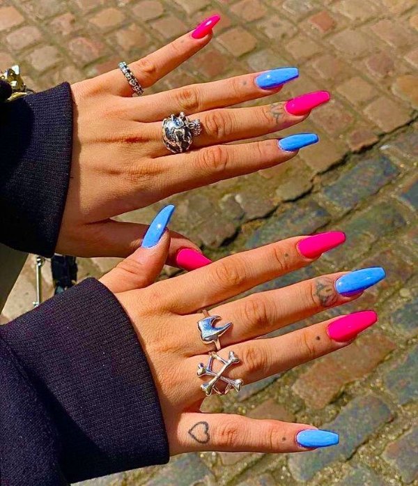 دو رنگ آبی و صورتی در ترکیب با هم حسی تمیزی، رویا، لطافت و معصومیت القا میکنند و به خصوص برای دختران نوجوان انتخابی عالی برای طرح روی ناخن هستند.