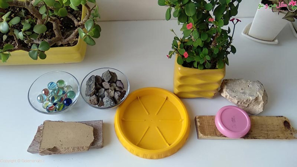 - ابتدا باید برای هر گلدان یک زیرگلدانی با اندازه بزرگتر از آن تهیه کنید. دقت کنید که زیرگلدانی باید چند سانتیمتر بزرگتر از کف گلدان باشد.