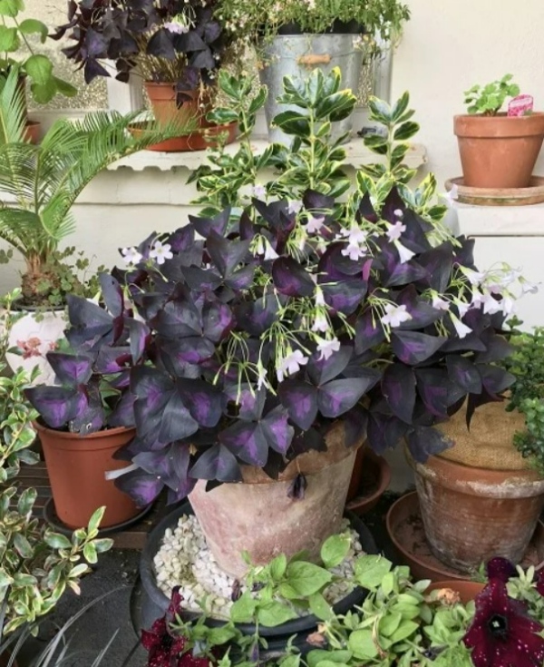 این گیاه به دلیل برگ های مثلثی و بنفش تیره که در شب تا میشوند شهرت دارد. این گیاه بنفش زیبا، گلهایی به رنگ اسطوخودوس روشن یا صورتی تولید میکند.