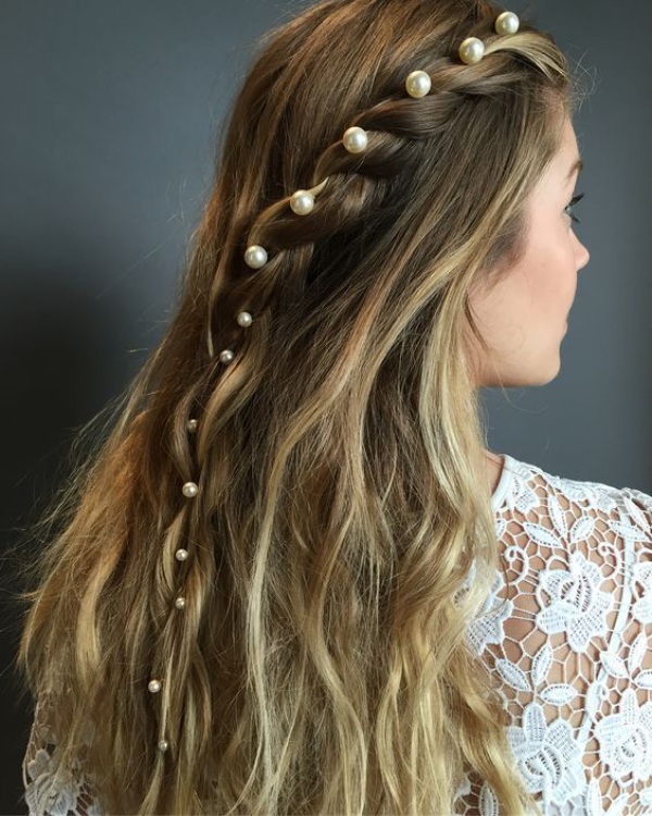 با این مدل موهای بافت با اکسسوری مروارید میتوانید برای مهمانیهای خود ایده بگیرید.