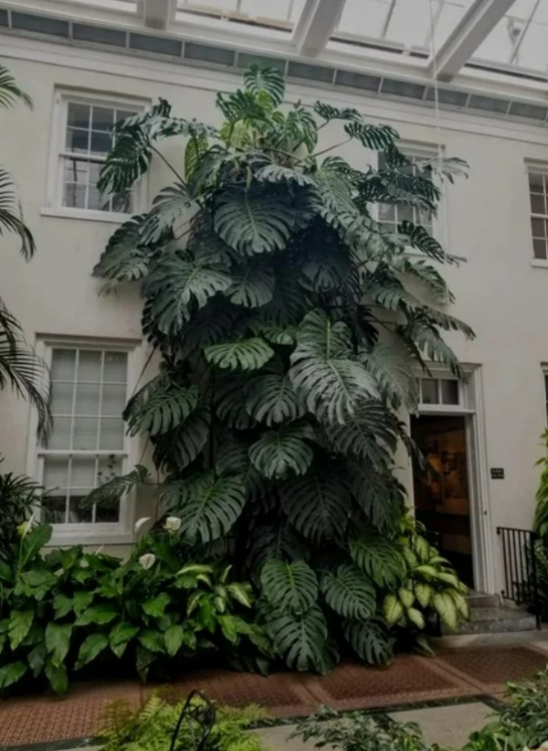 این مانسرتا غول پیکر را ببینید که سن آن آنقدر زیاد است که حتی برگهایش خم شده است. این گیاه آپارتمانی صد ساله و غول پیکر را میتوانید در باغ های لانگ وود در میدان کنت، مشاهده کنید.