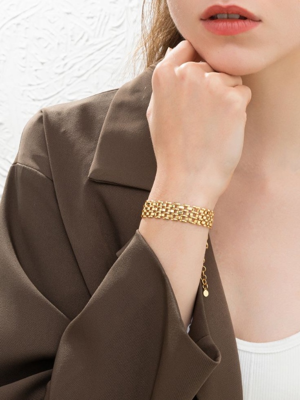 پهنای دستبند یا النگو ، اندازه مهره ها و سایر مواردی که در آن به کار برده شده است و وزن ظاهری دستبند نیز مهم است. دستبندهای پهن طلا برای انواع دستها مناسب هستند، اما به طور کلی روی مچهای ظریفتر زیباتر به نظر میرسند. دلیل این امر این است که دستبندهای پهن میتوانند مچهای ظریف را باریکتر و زیباتر نشان دهند.