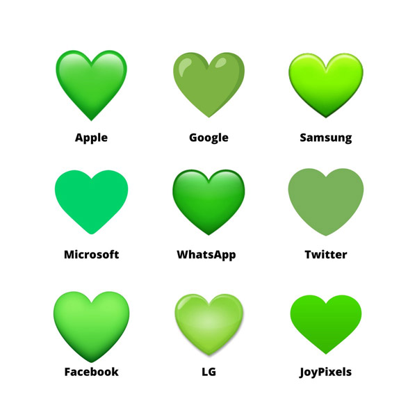 رنگ سبز می تواند نماد چیزهای مختلفی باشد، از جمله غبطه خوردن، محیط زیست (شغل سبز)، و همه چیز ایرلندی (سبز روی پرچم ملی جزیره زمرد است). ایموجی قلب سبز 💚 معمولاً برای اشاره به همه آنها استفاده می شود.