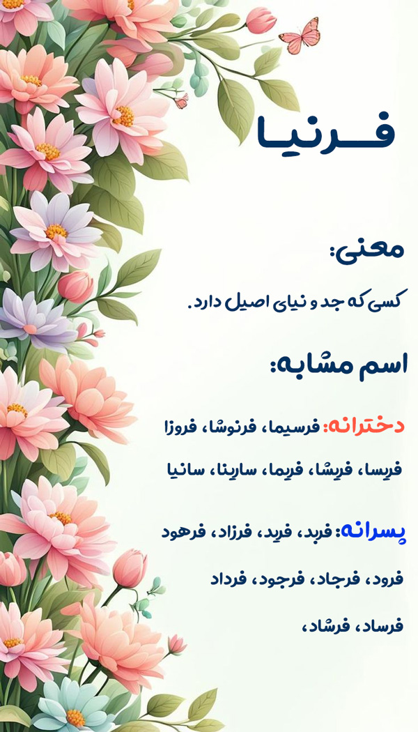 فرنیا نامی با ریشه فارسی است و به معنی اسم فرنیا یعنی کسی که دارای اصل و نسب است. این نام خوشآهنگ و دلنشین مورد پسند والدینی است که برای نامگذاری فرزندشان به اصیل بودن و خاص بودن اسم اهمیت میدهند.
