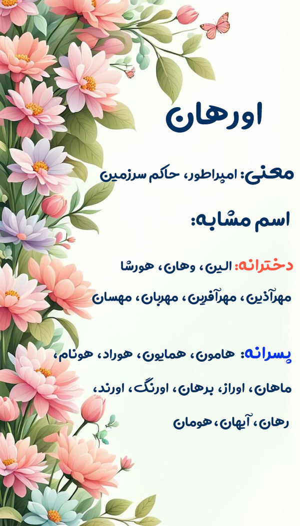 معنی اسم اورهان، “امپراطور، حاکم سرزمین”، ذکر شده است. اورهان از جمله اسامی پسرانه خوشآوا و دلنشین با ریشه ترکی است.