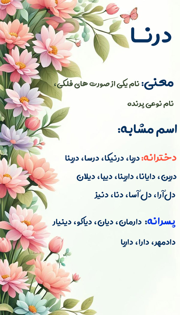 درنا جزء اسامی دخترانه چهارحرفی، با ریشه اوستایی و عبری است که از دید بسیاری از پدر و مادرها به عنوان یک اسم جدید و امروزی برای فرزند دخترشان، گزینه مناسبی است. نظر شما در مورد اسم درنا چیست؟ آیا این اسم را برای فرزند خود میپسندید؟ چه اسامی دیگری میشناسید که به این اسم شبیه باشند؟ لطفا نظرات و دیدگاههای خود را با ما و سایر مخاطبان ستاره به اشتراک بگذارید.