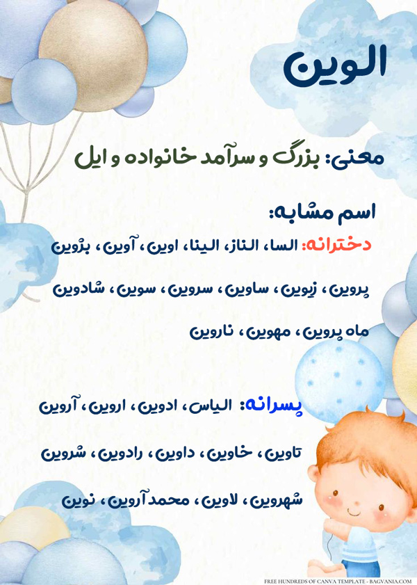به یاد داشته باشید که مهمترین موضوع این است که خودتان این اسم را دوست داشته باشید و از آوا و تلفظ آن احساس خوشایندی به شما دست دهد. الوین از آن دسته از اسامی زیبای پسرانه فارسی است که تمام نکات مهم در انتخاب یک اسم زیبا در آن رعایت شده است و میتوان آن را جزء اسامی خاص پسرانه به حساب آورد.
