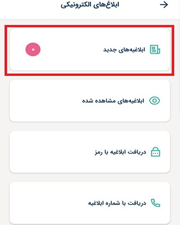 - با ورود به بخش ابلاغهای الکترونیک، صفحه زیر برای شما نمایش داده میشود. برای مشاهده ابلاغیه ها، گزینه «ابلاغیههای جدید» را انتخاب کنید. اگر ابلاغ جدیدی برای شما ثبت شده باشد، در کنار این گزینه عدد یا علامتی برای اطلاعرسانی نمایش داده خواهد شد.