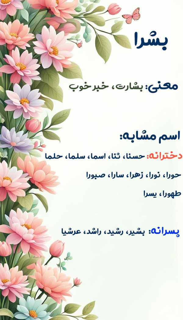 معنی اسم بشرا “بشارت، خبر خوب، مژده، مژدگانی” ذکر شده است. این نام عربی از جمله نامهای زیبای دخترانه است که برای نامگذاری فرزندتان گزینه مناسبی است.