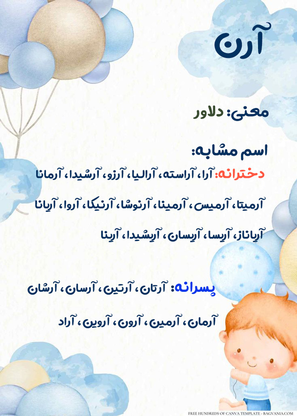 آرن یکی از اسمهای کردی است که تکرار دوبار حرف “آ” در آن، باعث خوش آوایی این اسم شده است. این نام از اسمهای پر طرفدار میان ایرانیان در سالهای اخیر بوده که میتوان آن را جزء اسمهای پسرانه جدید و زیبا حساب کرد. در پایان پیشنهاد میکنیم اگر به دنبال اسامی باکلاس پسرانه هستید، بهترین اسامی پسرانه و نکاتی برای انتخاب اسم را نیز در ستاره بخوانید. همچنین اگر به دنبال اسامی پسرانه کردی هستید، میتوانید با اسامی پسرانه کردی نیز در ستاره آشنا شوید.