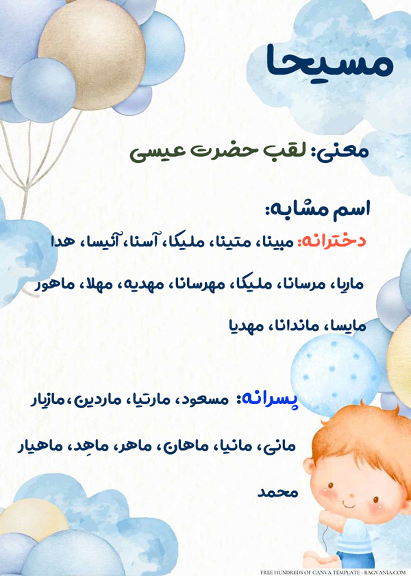معنی اسم مسیحا در ریشه عربی، لقب حضرت عیسی (ع) می باشد. از اسم های پسرانه مشابه مسیحا ، مسعود، محمد و … را می توان نام برد.