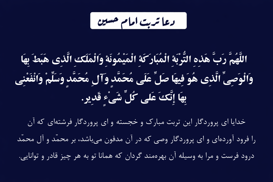 ترجمه: خدایا به حق این تربت شریف و به حق هر که در آن وارد شده است و اقامت گزیده در آن و به حق جد و پدرش و مادرش و برادرش و امامان از نسلش و به حق فرشتگانی که در طواف او حلقه زده اند که قرار دهی آن را درمان هر دردی و بهبودی از هر بیماری و نجات از هر آفت و نگهداری از هر چه بیم دارم و می هراسم ، سپس آن را استعمال نماید.