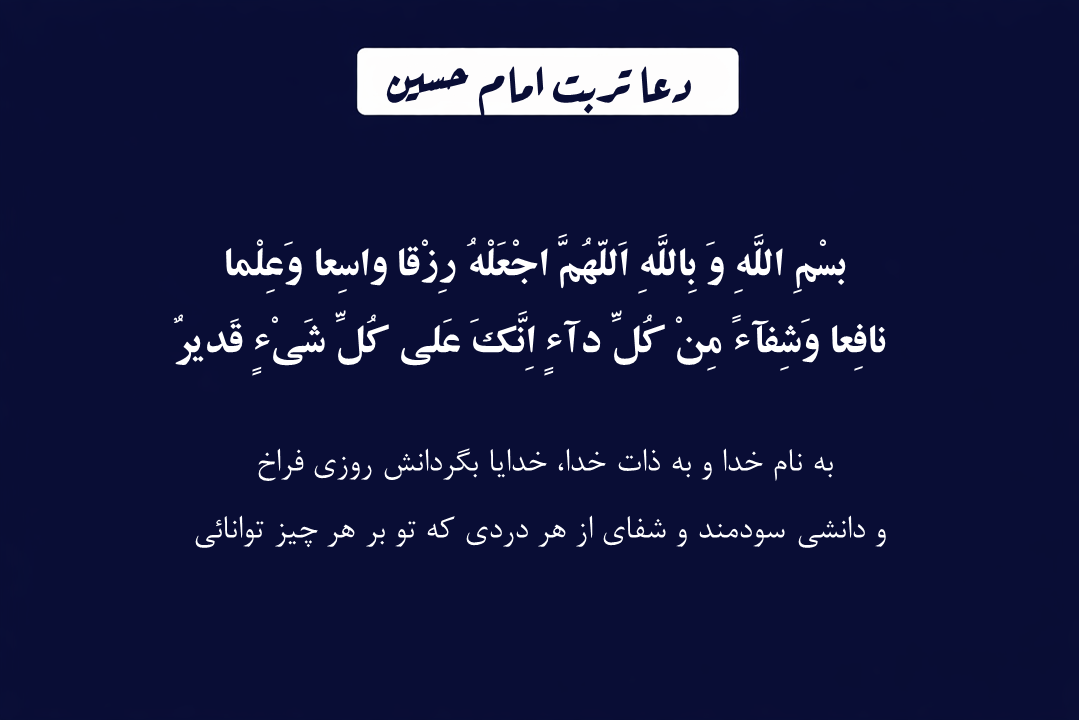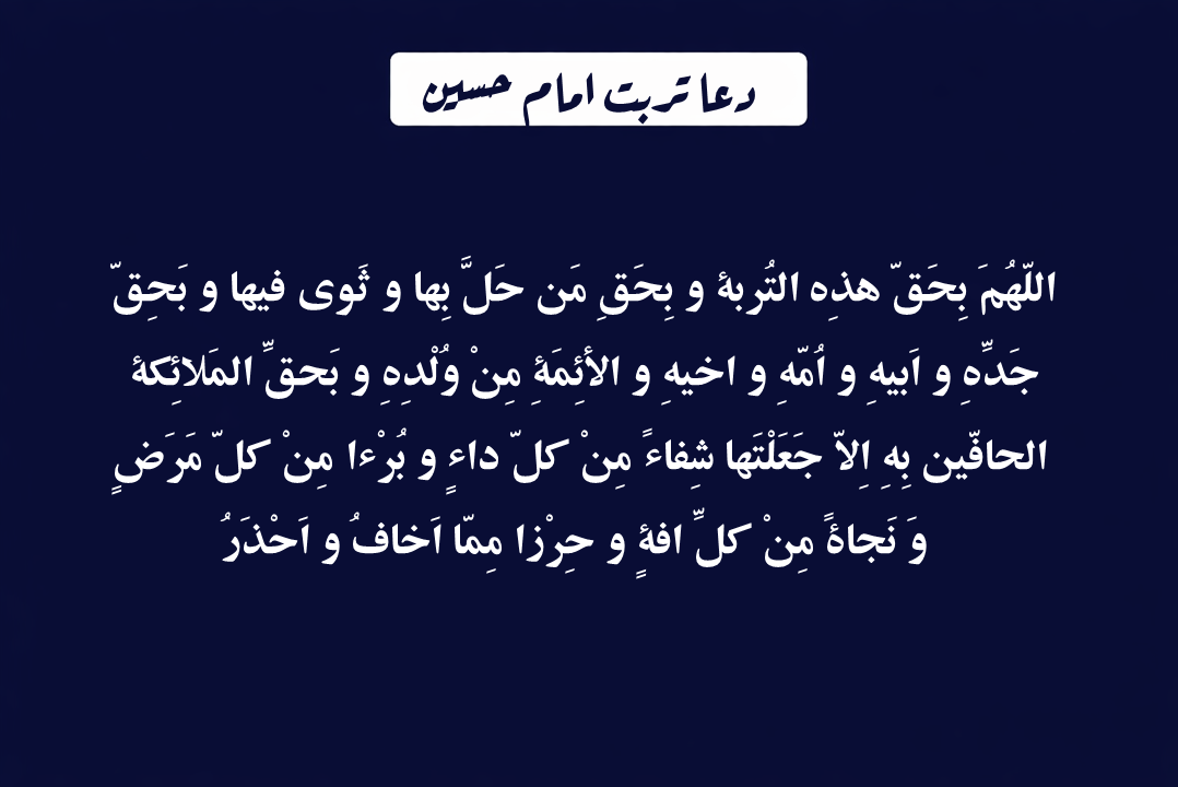 این دعای تربت امام حسین در مفتایج الجنان ذکر شده و به شرح زیر است. این دعا برای آسان شدن جراحی نیز توصیه میشود. برای این منظور کافیست مطلب بهترین دعاهای آرامش قبل از عمل را مطالعه نمایید.
