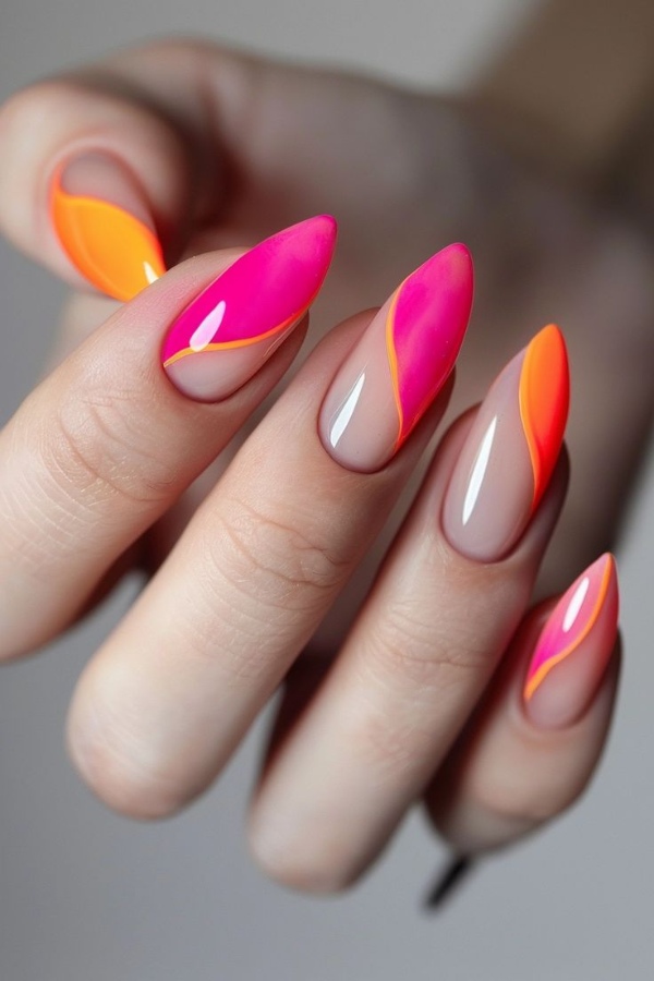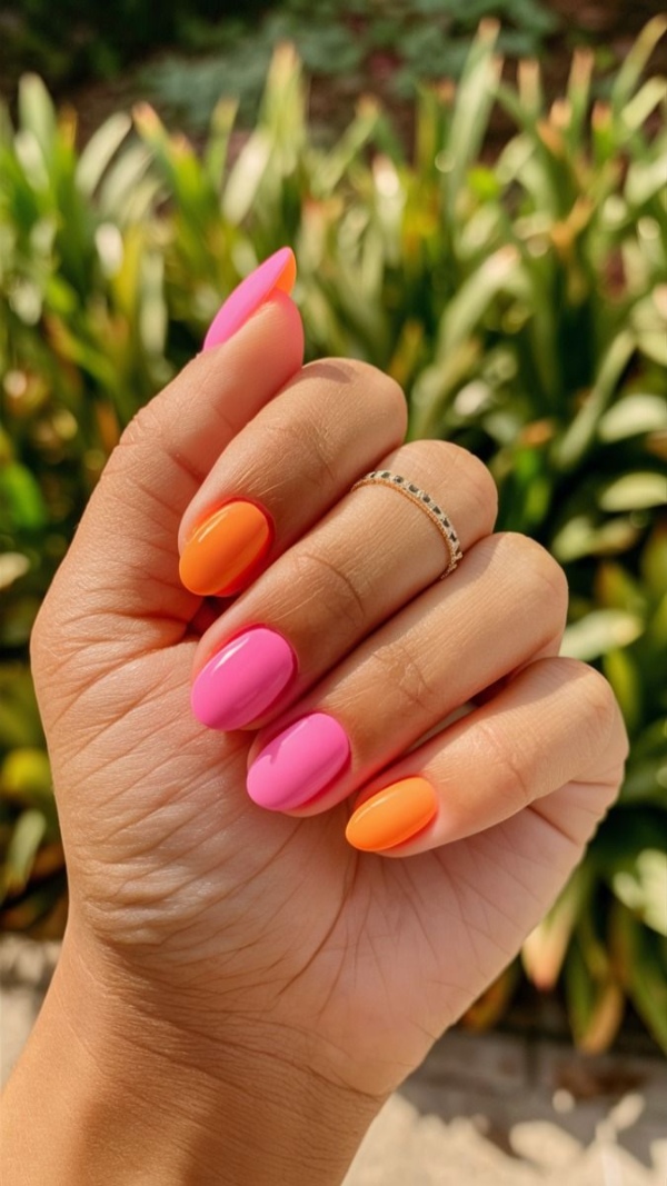 استایل جشن و مهمانی: ناخنهای نارنجی و صورتی میتوانند به عنوان انتخابی زنده و شاداب برای مهمانیها و جشنها در نظر گرفته شوند. میتوانید این ناخنها را با لباسهای رنگارنگ و پرزرق و برق هماهنگ کنید.