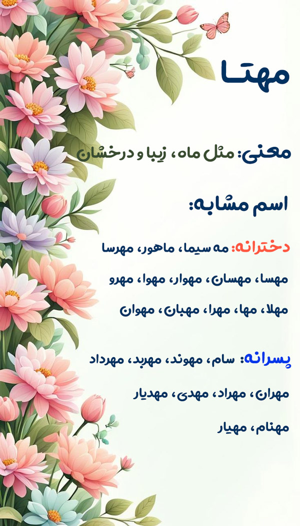 اسم مهتا یکی از اسامی دختر چهار حرفی برای نامگذاری فرزند دختر است که علاوه بر خوش آوا بودن، معنی زیبایی هم دارد. همچنین برای یافتن اسم مشابه مهتا می توانید از نظر شما در مورد اسم دخترانه مهتا چیست؟ آیا به نظر شما این نام برای فرزند دختر شما مناسب است؟ لطفا نظرات و تجربیات ارزشمند خود را با ما و سایر همراهان ستاره در میان بگذارید.