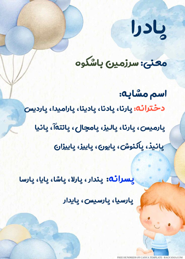 انتخاب اسم زیبا، یک دغدغه شیرین برای والدینی است که در انتظار مسافر کوچک خود هستند. در میان اسامی پسرانه، همانطور که اشاره شد، پادرا یکی از اسمهای زیبا است. پادرا از اسامی پسرانه پنج حرفی با ریشه فارسی بوده که به عنوان یکی از بهترین اسمهای پسرانه میتوان از آن یاد کرد. نظر شما در مورد اسم پادرا چیست؟ آیا این اسم را برای نامگذاری فرزند خود مناسب میدانید؟ چه اسامی دیگری میشناسید که به این اسم شبیه باشند؟ لطفا نظرات و دیدگاههای خود را با ما و سایر مخاطبان ستاره به اشتراک بگذارید.
