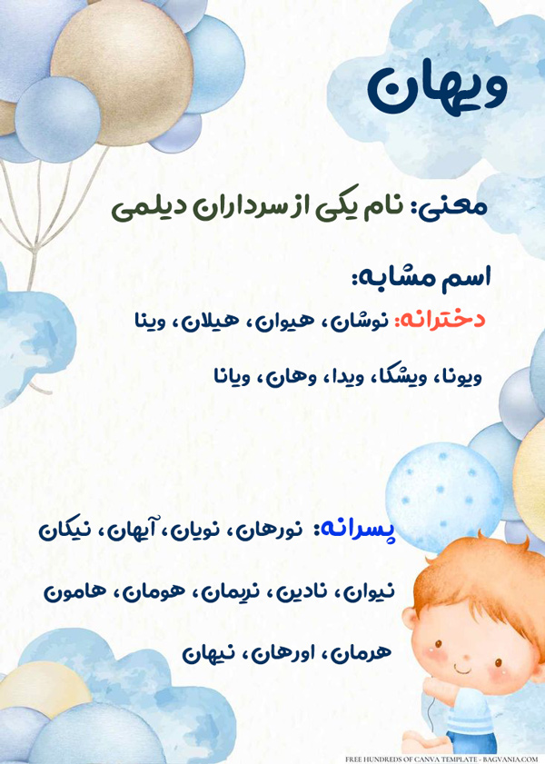 معنی اسم ویهان، “نام یکی از سرداران دیلمی، علت و سبب (در زبان پهلوی)”، ذکر شده است. این اسم یکی از اسامی زیبای پسرانه بوده که اخیرا بسیار محبوب شده است.