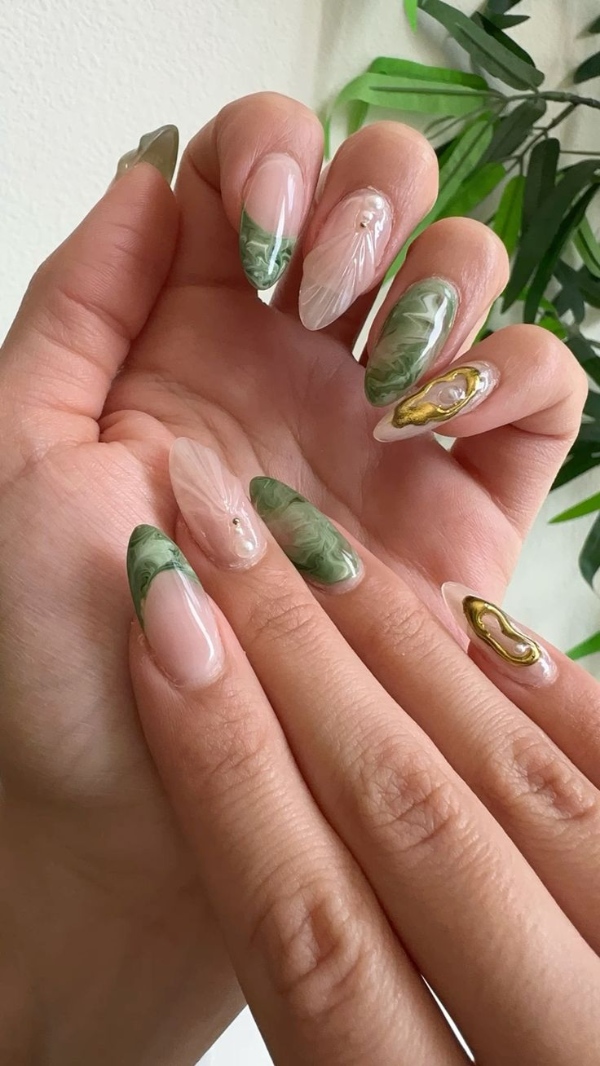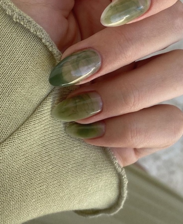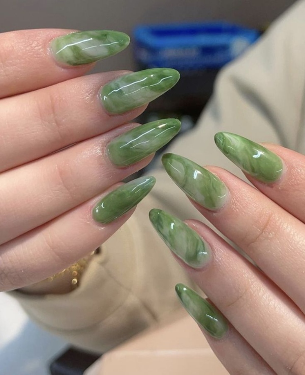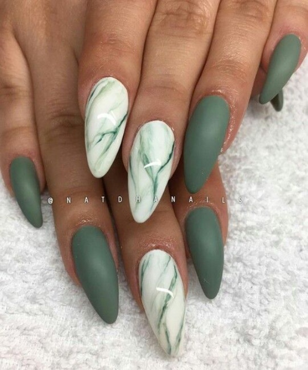 مدل ناخن پاییزی نوک تیز سبز مرمری