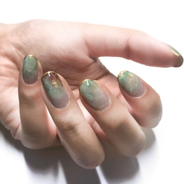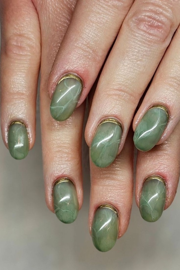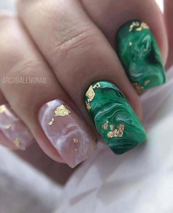 مدل ناخن کوتاه سبز و طلایی مرمری