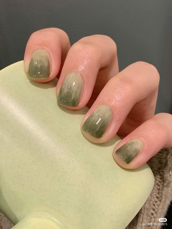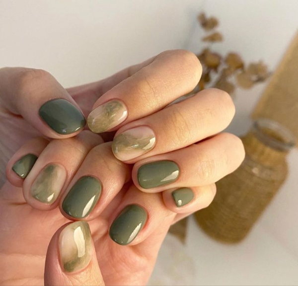 طرح پاییزی و جذاب سبز مرمری ناخن کوتاه