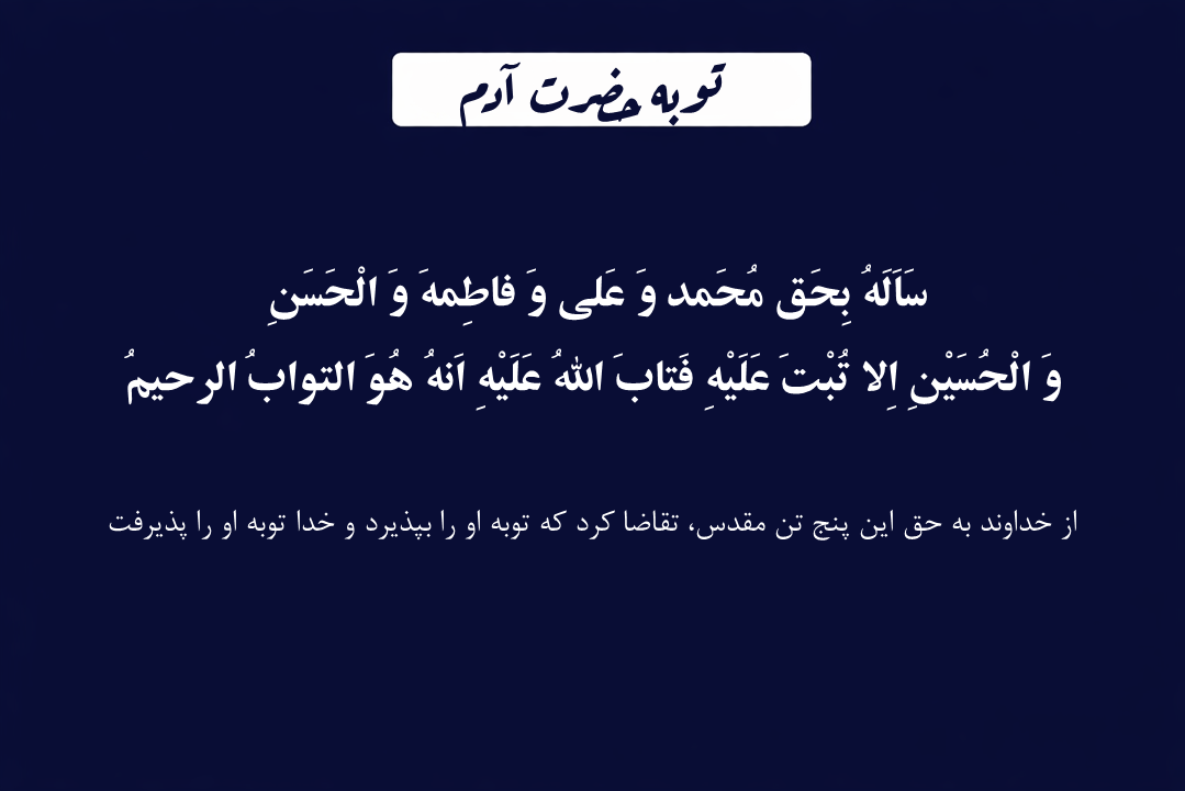 «هنگامى که آدم مرتکب آن خطا شد و از پیشگاه خداوند متعال پوزش طلبید، عرض کرد: پروردگارا توبه مرا بپذیر و عذر مرا قبول کن، من به آثار سوء گناه و خوارى آن با تمام وجودم پى بردم. خداوند فرمود: آیا به خاطر ندارى که به تو دستور دادم در شداید و سختی ها و حوادث سنگین و دردناک، به محمد و آل پاک او مرا بخوانى؟ آدم عرض کرد: پروردگارا آرى. خداوند فرمود: آنها محمد و على و فاطمه و حسن و حسین (علیهم السلام) هستند پس مرا به نام آنها بخوان تا تقاضاى تو را بپذیرم و بیش از آنچه مى خواهى به تو بدهم».(شرح نهج البلاغه مرحوم خویى، ج ۲، ص ۱۱۸)