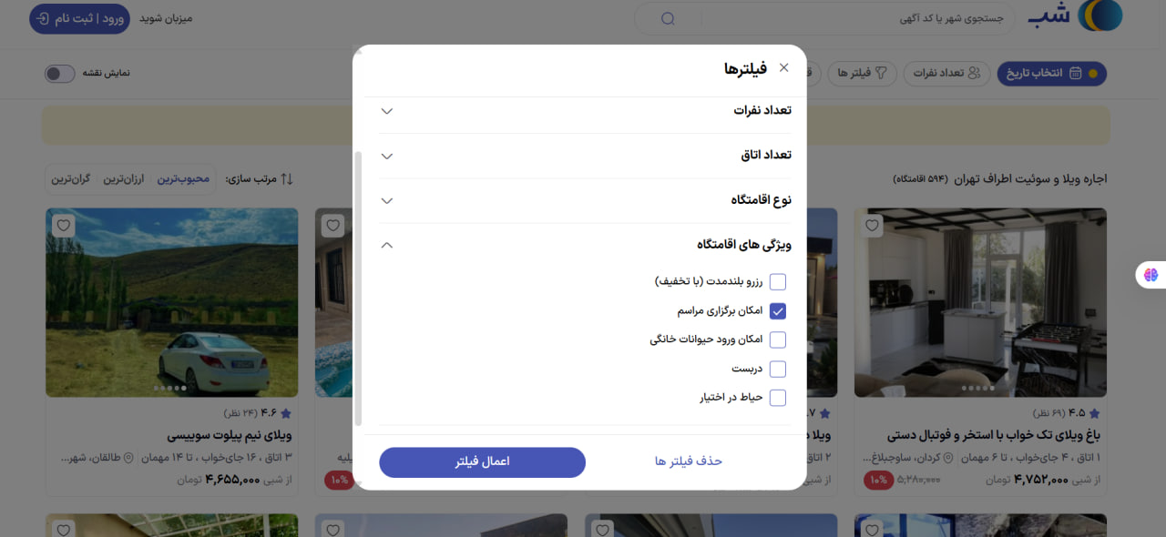 اگر در میان گزینههای معرفی شده در مقاله هیچ کدام به دلتان ننشست یا مایل بودید بیشتر بگردید، میتوانید وارد سایت شب شده و لیست اقامتگاههای موجود را براساس ویژگیهای اقامتگاه، نوع اقامتگاه و امکانات مدنظرتان فیلتر کنید تا سرراست به گزینه محبوبتان برسید. یادتان نرود در اگر قصد برگزاری تولد و مهمانی را دارید، گزینه امکان برگزار مراسم را هم حتما انتخاب کنید.