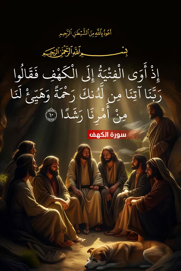 إِذْ أَوَى الْفِتْيَةُ إِلَى الْكَهْفِ فَقَالُوا رَبَّنَا آتِنَا مِنْ لَدُنْكَ رَحْمَةً وَهَيِّئْ لَنَا مِنْ أَمْرِنَا رَشَدًا ﴿١٠﴾