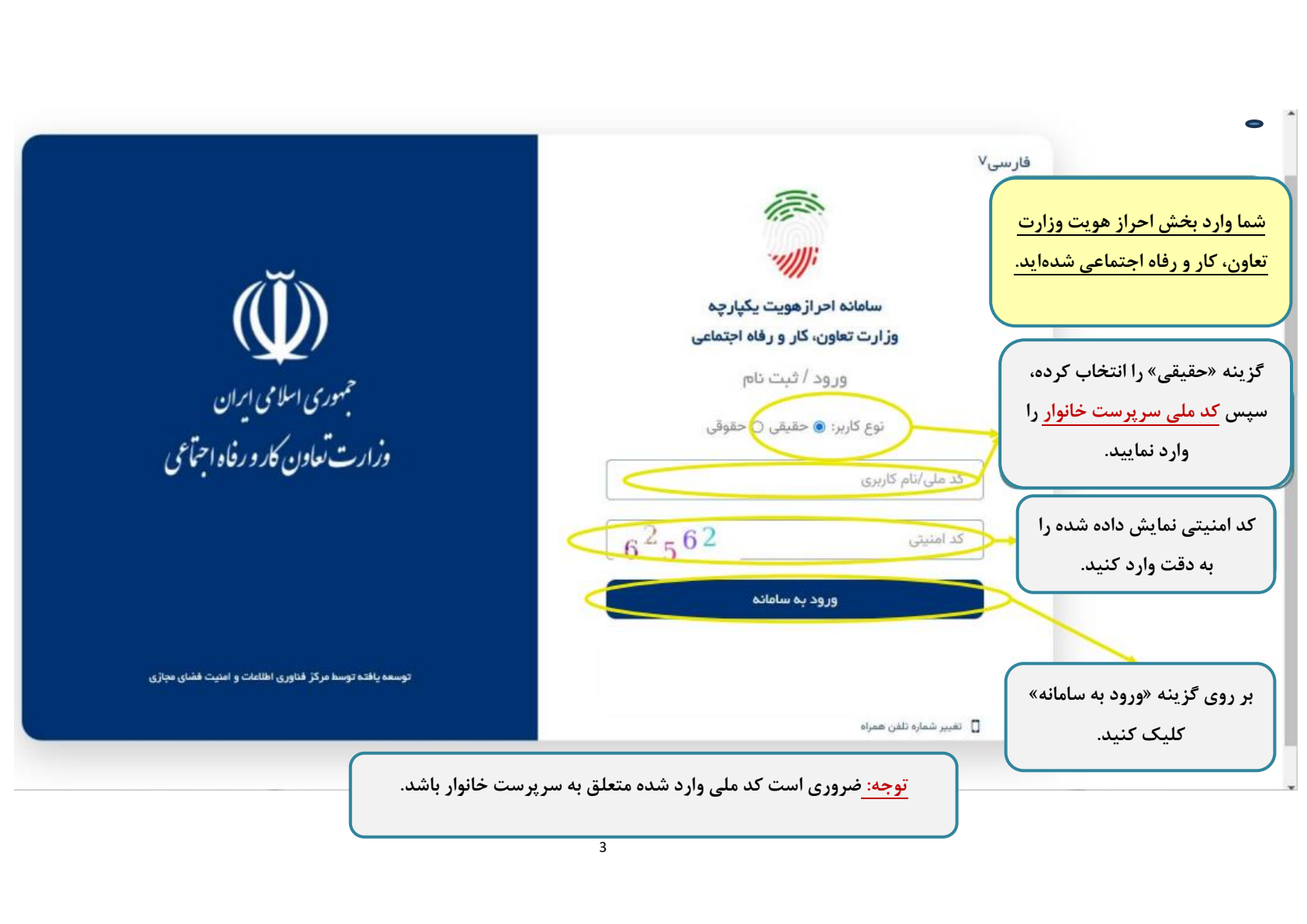 مرحله اول: در این بخش طبق تصویر گزینه «حقیقی» را انتخاب کرده و سپس کد ملی سرپرست خانوار را در کادر مربوطه وارد نمایید. در ادامه، کد امنیتی نمایشدادهشده را با دقت درج کرده و در نهایت با کلیک روی گزینه «ورود به سامانه» وارد سامانه شوید. توجه داشته باشید که کد ملی واردشده حتماً باید متعلق به سرپرست خانوار باشد.