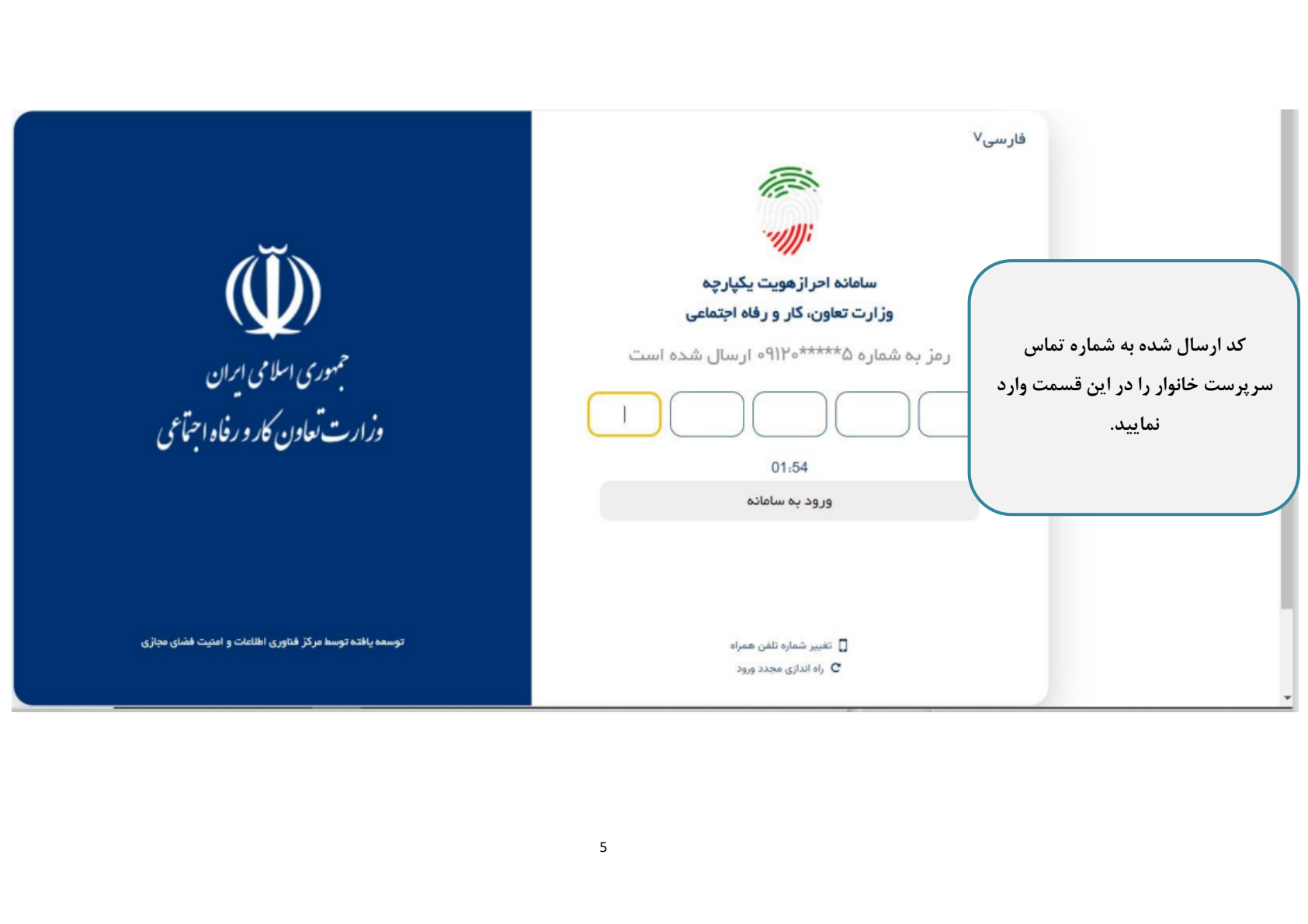 مرحله سوم: پس از ارسال رمز یکبارمصرف به شماره تلفن همراه سرپرست خانوار، کد پیامکشده را در بخش مربوطه وارد کرده و برای ادامه مراحل، روی گزینه «ورود به سامانه» کلیک کنید.