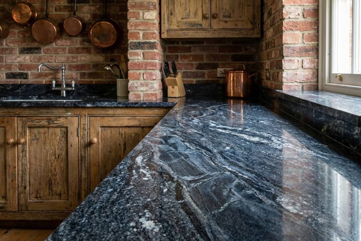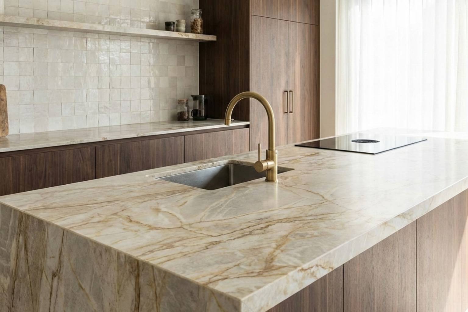 - سنگ طبیعی: سنگهای طبیعی مانند گرانیت و مرمر، جلوهای متمایز و غیرتکراری ایجاد میکنند. اما چون این سنگها درز دارند، ممکن است رطوبت از لای آنها نفوذ کند و به کابینت آسیب بزند؛ پس نیاز به مراقبت بیشتری دارند.