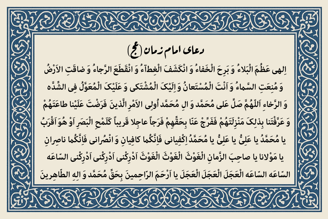 اَللّهُمَّ اِنّا نَسْئَلُکَ وَ نَدْعُوکَ بِاسْمِکَ الْعَظيمِ الاْعْظَمِ، اَلاْعَزِّ الاْجَلِّ الاْکْرَمِ بحقِّ امامِ زمانِنا، بِدَمِ المظلوم ده مرتبه يا اَللّهُ يا اَللّهُ يا اللّهُ